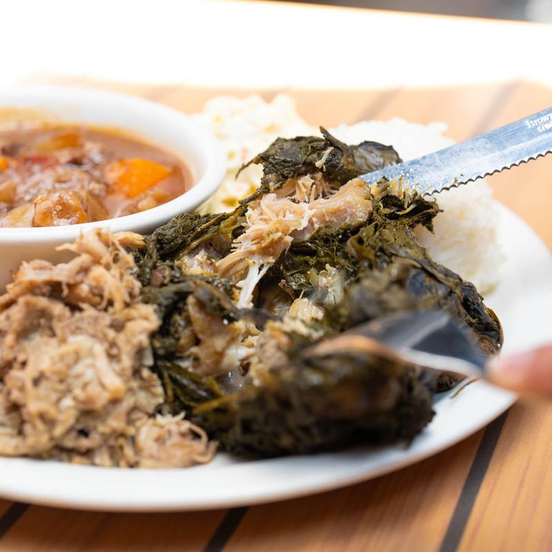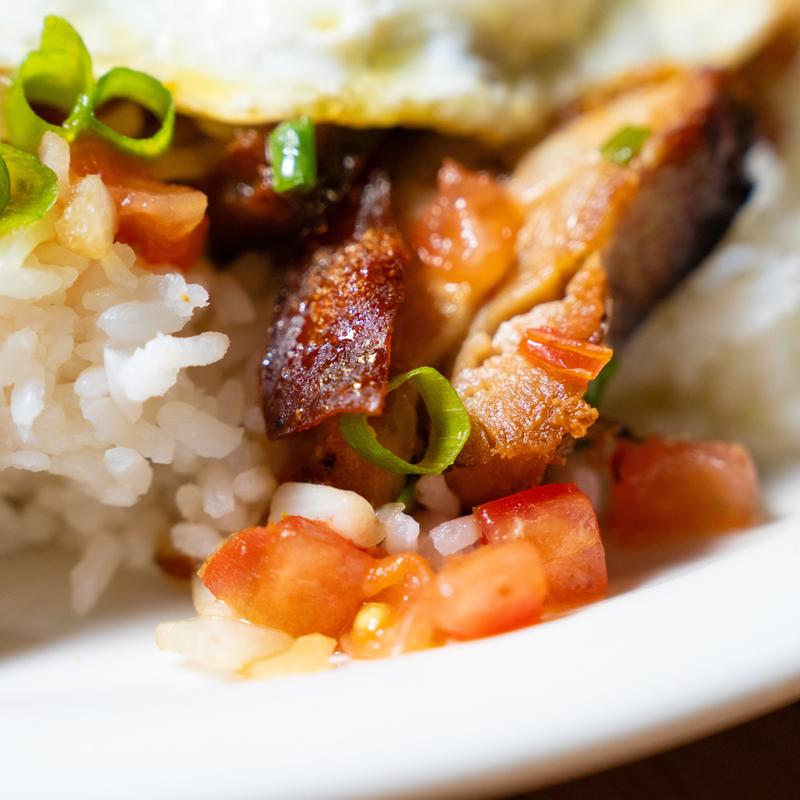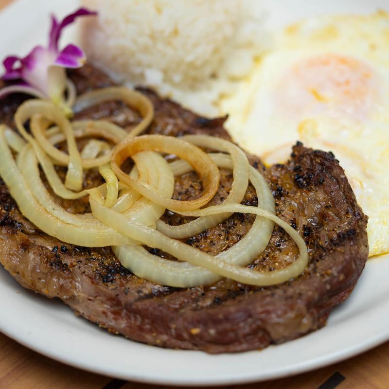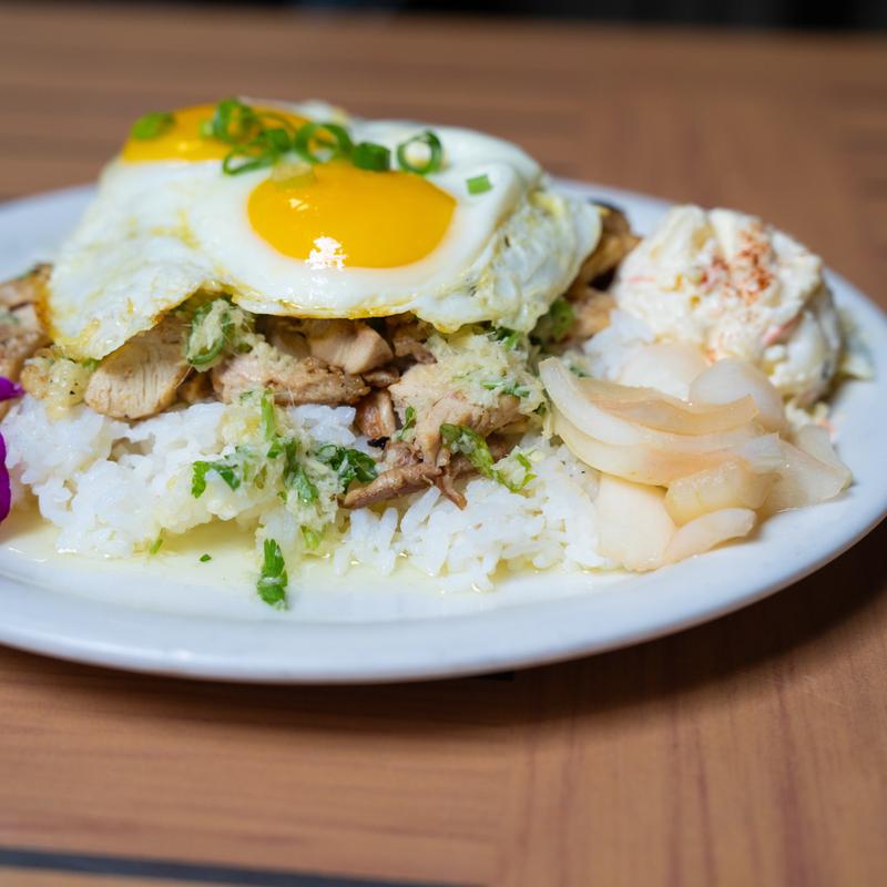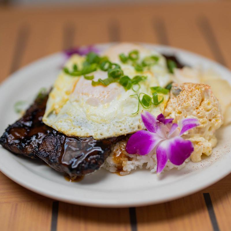 Served on a bed of steamed rice (white or brown), topped with 2 eggs any style, a mini-scoop of potato-mac salad & little bit homemade pickle-onion!
